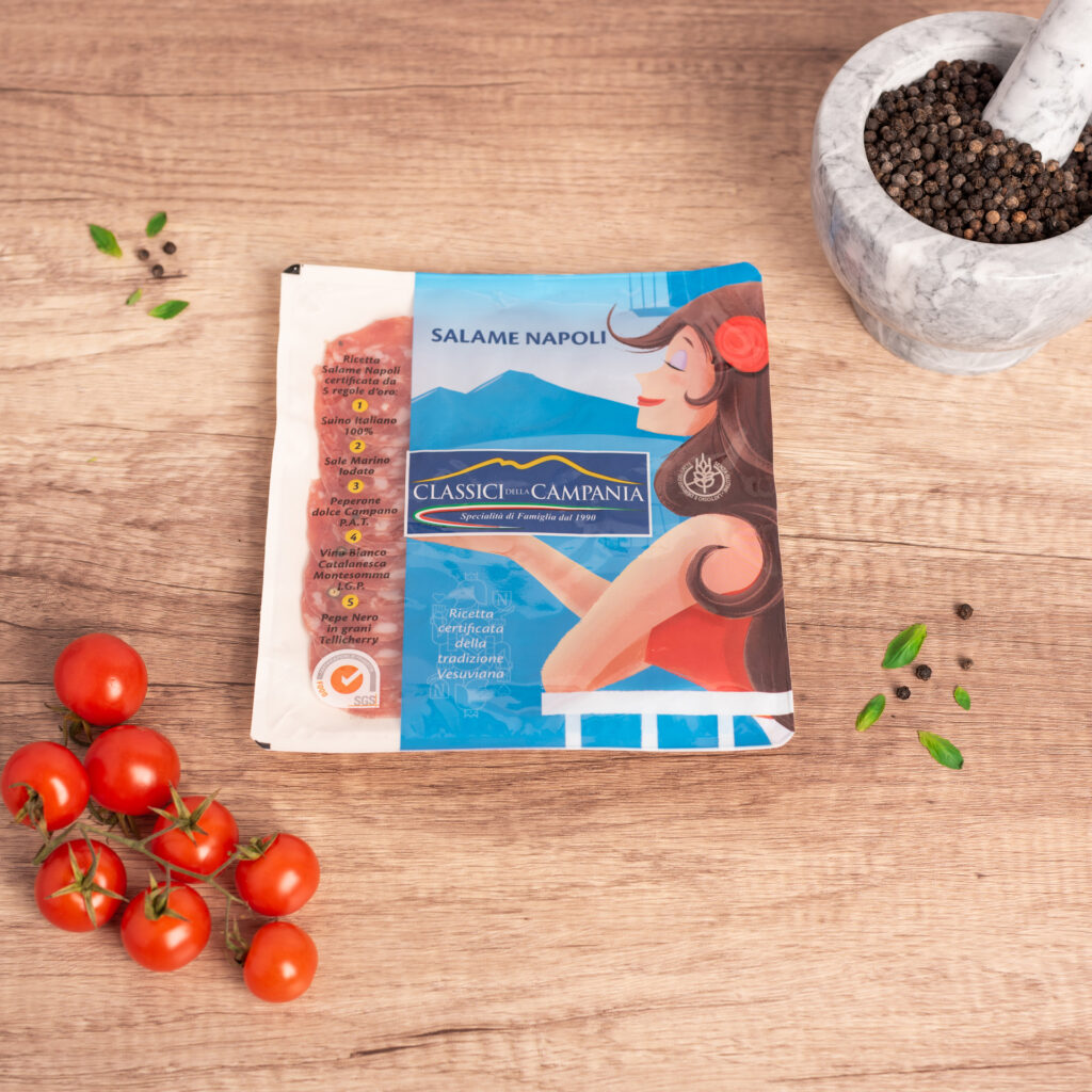 Il Salame Napoli è tipico della tradizione campana e la sua produzione avviene principalmente nella provincia di Napoli. Il Salame Napoli è estremamente versatile e può essere consumato sia da solo che come parte di altre ricette e preparazioni. Il gusto è dolce ma deciso, con sentori tipici degli ingredienti utilizzati grazie al processo di stagionatura non inferiore alle 6 settimane. Le note di affumicatura aggiungono profondità al gusto, mentre il pepe nero in grani arricchisce il sapore senza sovrastarlo, esaltando la carne in modo naturale. Una leggera sfumatura di vino bianco completa il profilo aromatico.